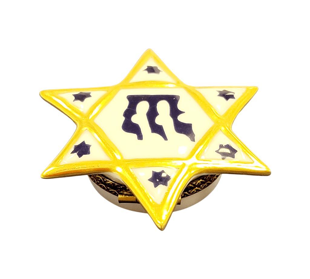 Introducing the exquisite Star of David Limoges Box Porcelain Figurine, a true masterpiece showcasing the beauty of Limoges porcelain. This stunning piece is handcrafted in France with meticulous attention to detail, making it an artistic treasure that celebrates the elegance and refinement of Jewish heritage. Perfect as a thoughtful gift for any occasion, this figurine is sure to enchant Judaica collectors and lovers of fine art alike.