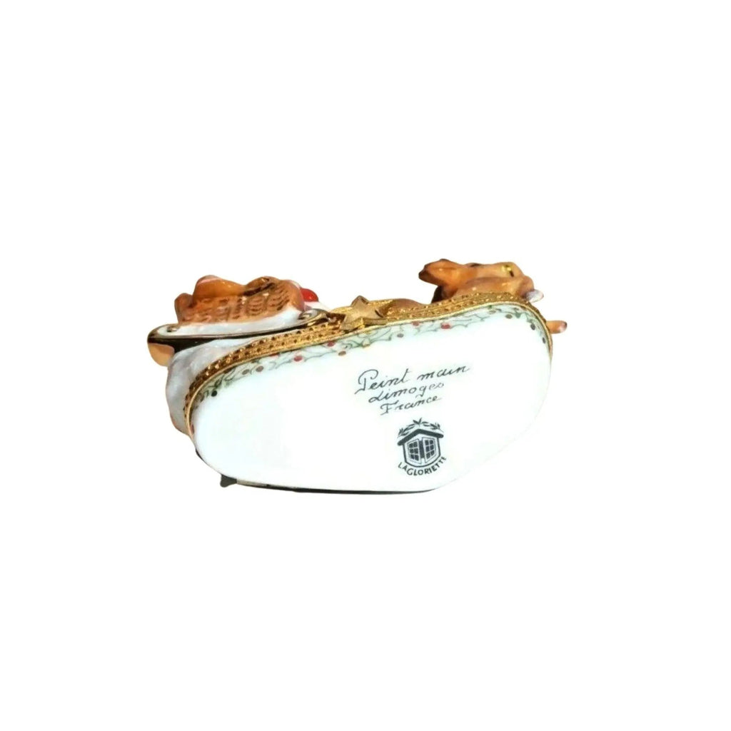 Experience the magic of the holiday season with our exquisite Santa Claus Teddy Bear on Sleigh with Reindeer. This stunning Limoges box, crafted from fine French porcelain, captures the whimsy and joy of Christmas, making it a perfect addition to your home decor or a treasured gift for loved ones.