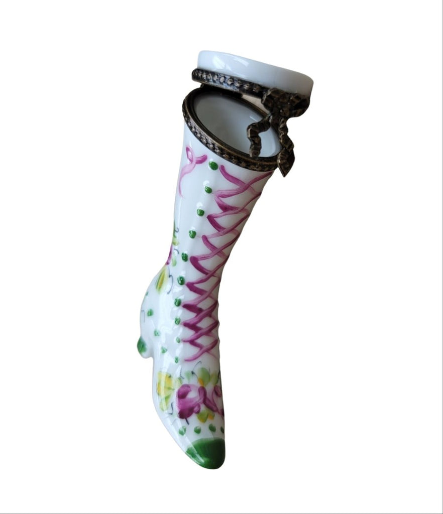 Ideal for collectors and fashion lovers alike, this Green Victorian Boot Limoges Box makes a perfect gift for special moments and celebrations. Backed by our satisfaction guarantee, you can confidently add this beautiful piece to your collection today!